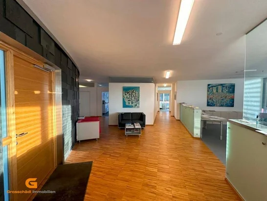 Das architektonisch anspruchsvolle Büro mit großzügigen Fensterfronten und einer beeindruckenden Terrasse liegt im Dachgeschoß eines markanten Büro und Geschäftshauses.
