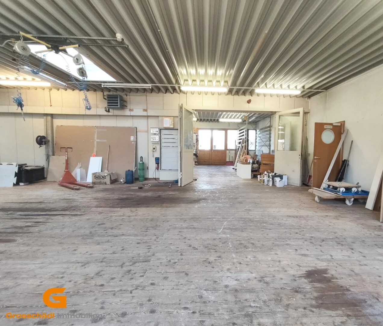 EG: ca. 460 m²: ca. 60 m² Bürobereich und ca. 400 m² zweigeteilte Halle/Werkstatt/Produktion