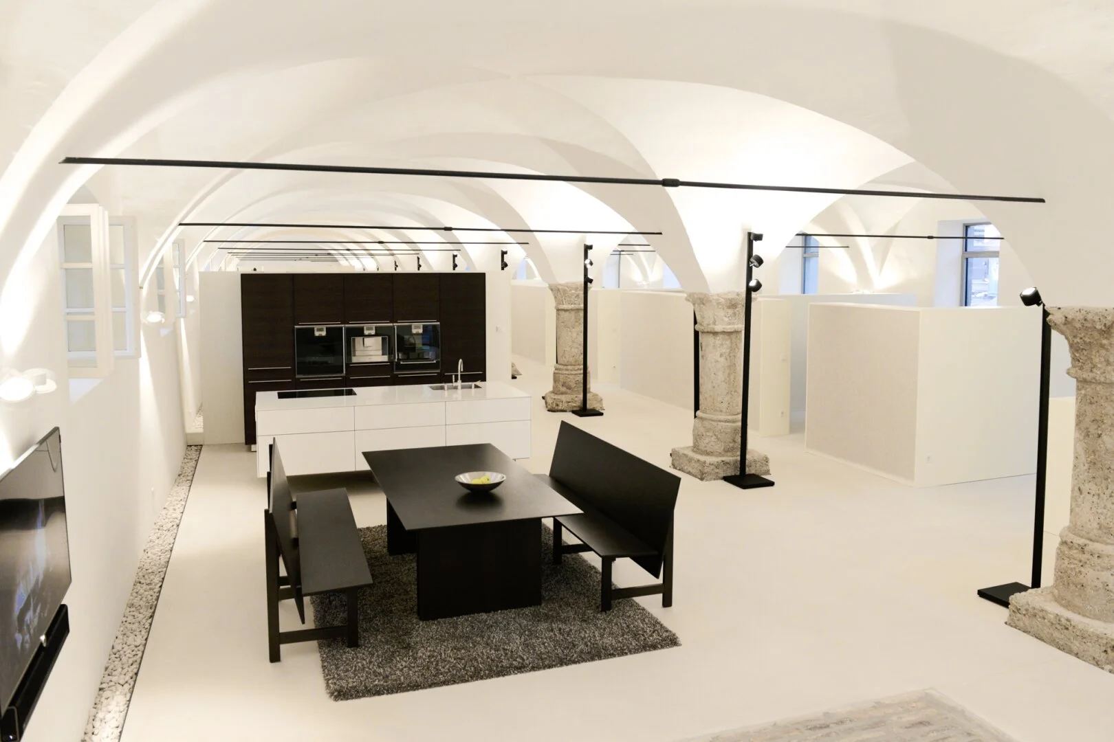 Die Bürofläche besticht durch einen repräsentativen Empfangs-/Eingangsbereich samt großzügiger Lounge für Besprechungen. Die Raumaufteilung sieht derzeit eine Vielzahl an Einzel-, Gruppenraumbüros und Besprechungsräume vor mit Platz für ca. 20 Arbeitsplätze und mehr. Die Büros sind voneinander getrennte durch Regale teils durch Glaswände bis unter das Deckengewölbe.