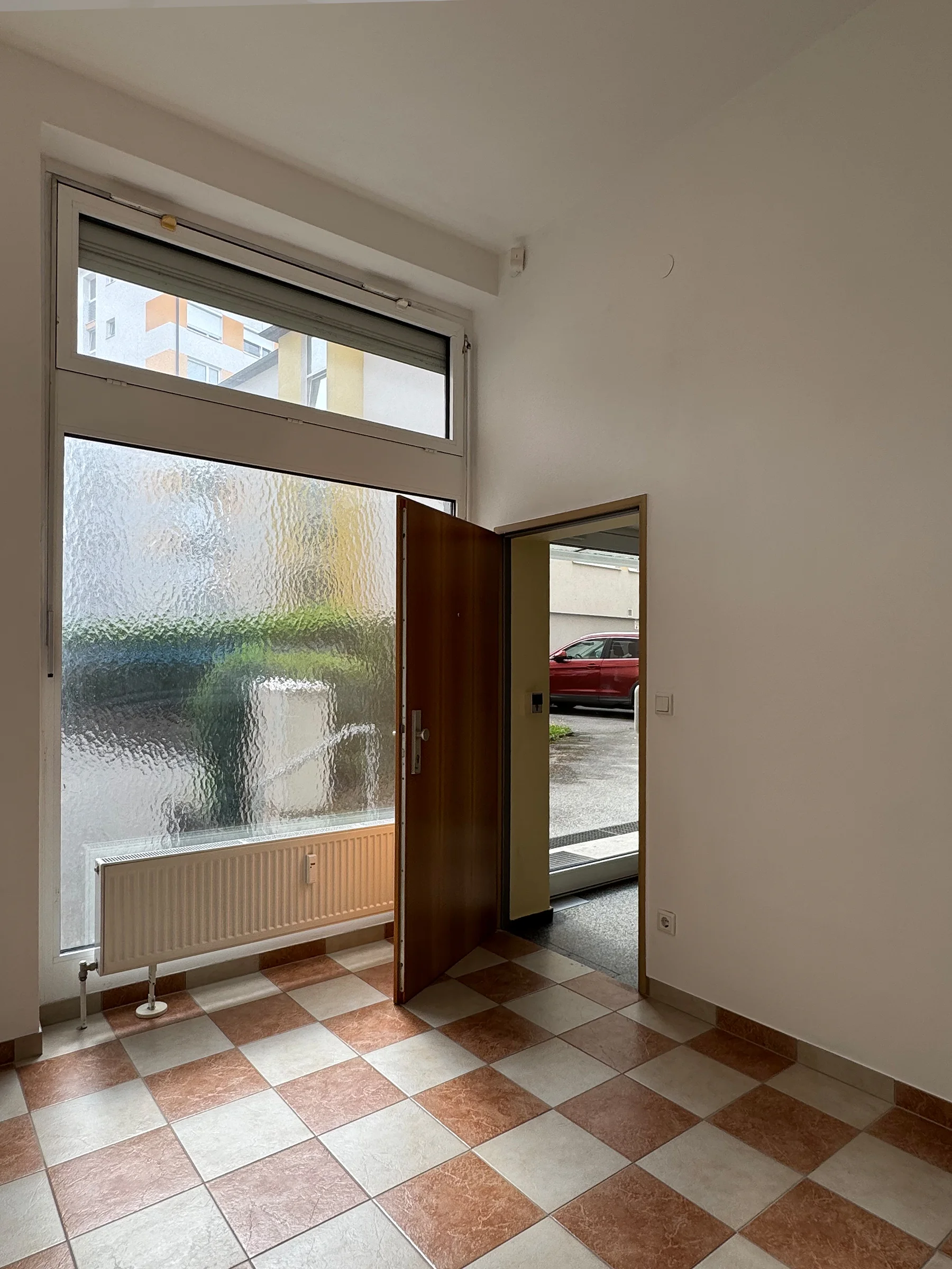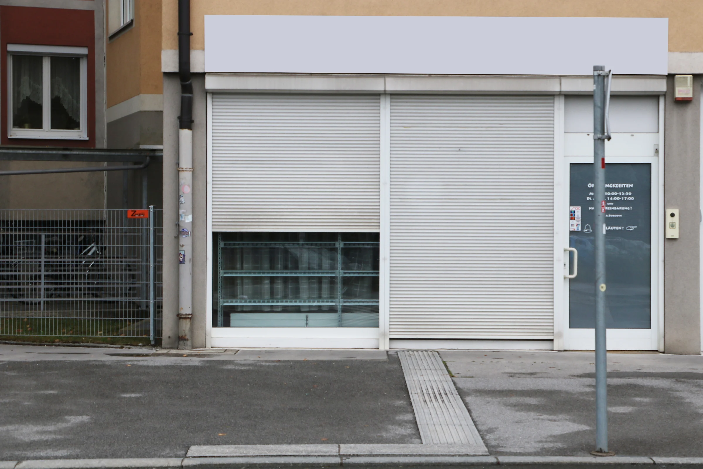 Es gibt 2 Eingangstüren in das Geschäft: eine von Straße und die Andere (schwere Sicherheitstür) im Hinterhof des Wohnblocks bzw. im Treppenhaus des Hauses.