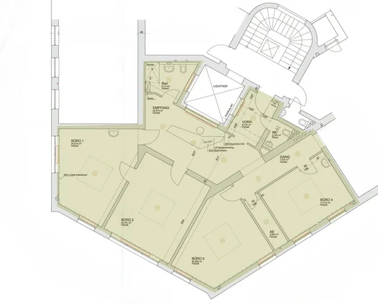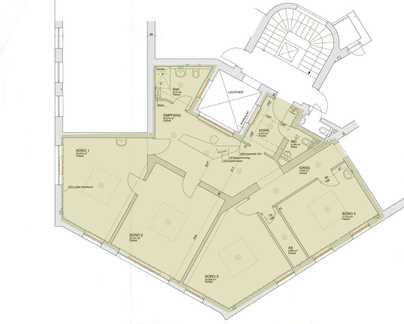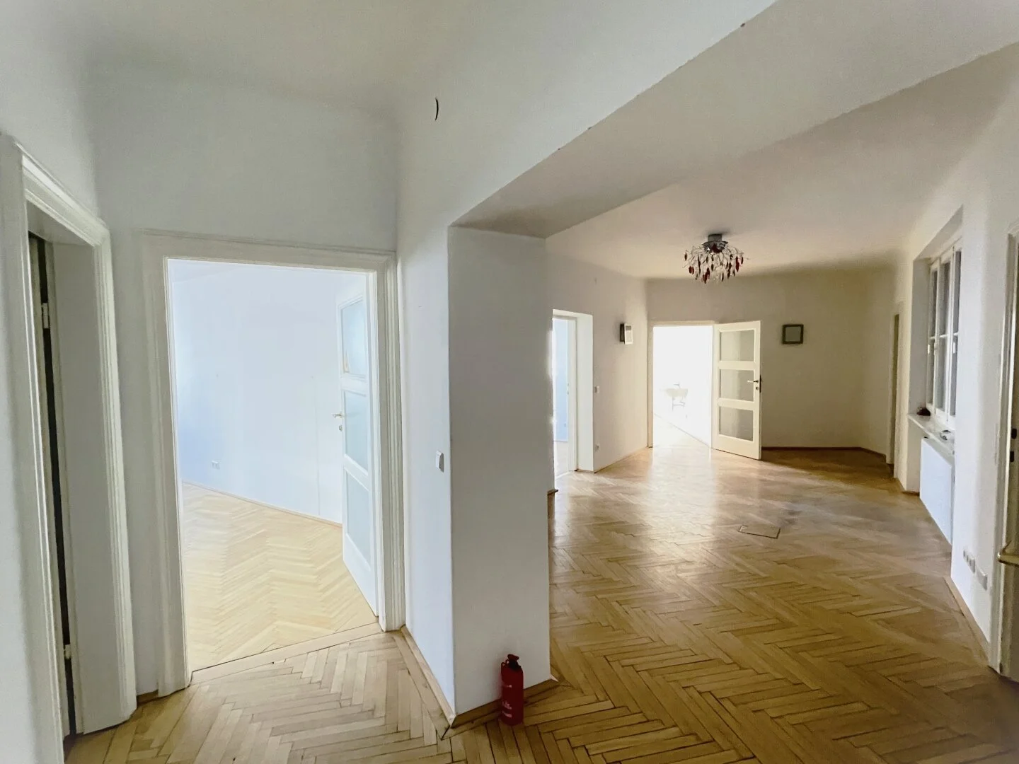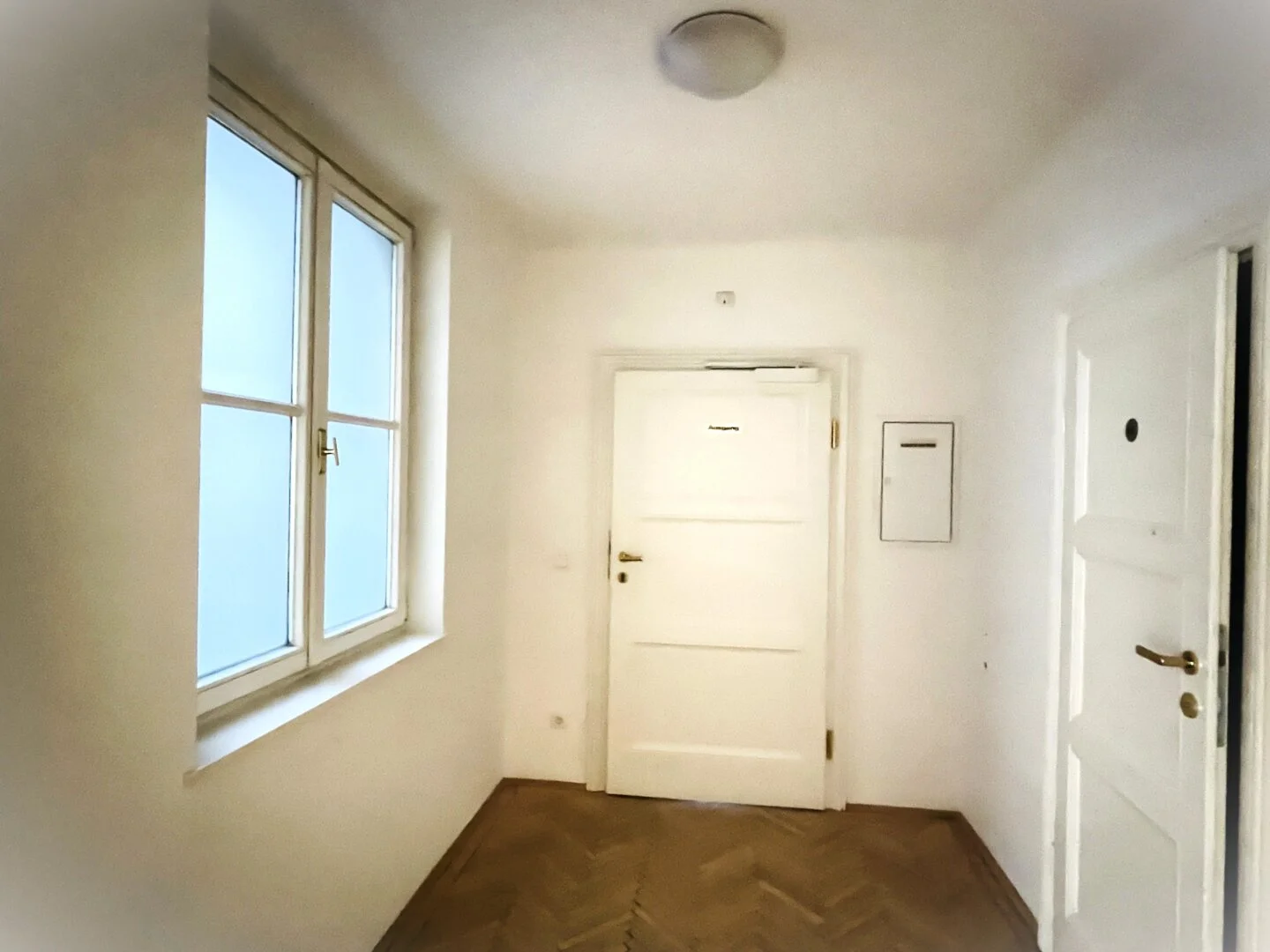 Die Einheit besticht durch eine großzügige und funktionale Raumaufteilung. Der repräsentative Empfangs- bzw. Wartebereich bildet das Zentrum der Ordination. Von hier aus sind vier geräumige, gut belichtete Ordinations- bzw. Behandlungsräume erreichbar, die je nach Bedarf miteinander verbunden werden können. Der Eichen-Fischgrätparkett, hohe Räume und große Fenster verleihen der Fläche ein elegantes Altbauambiente.