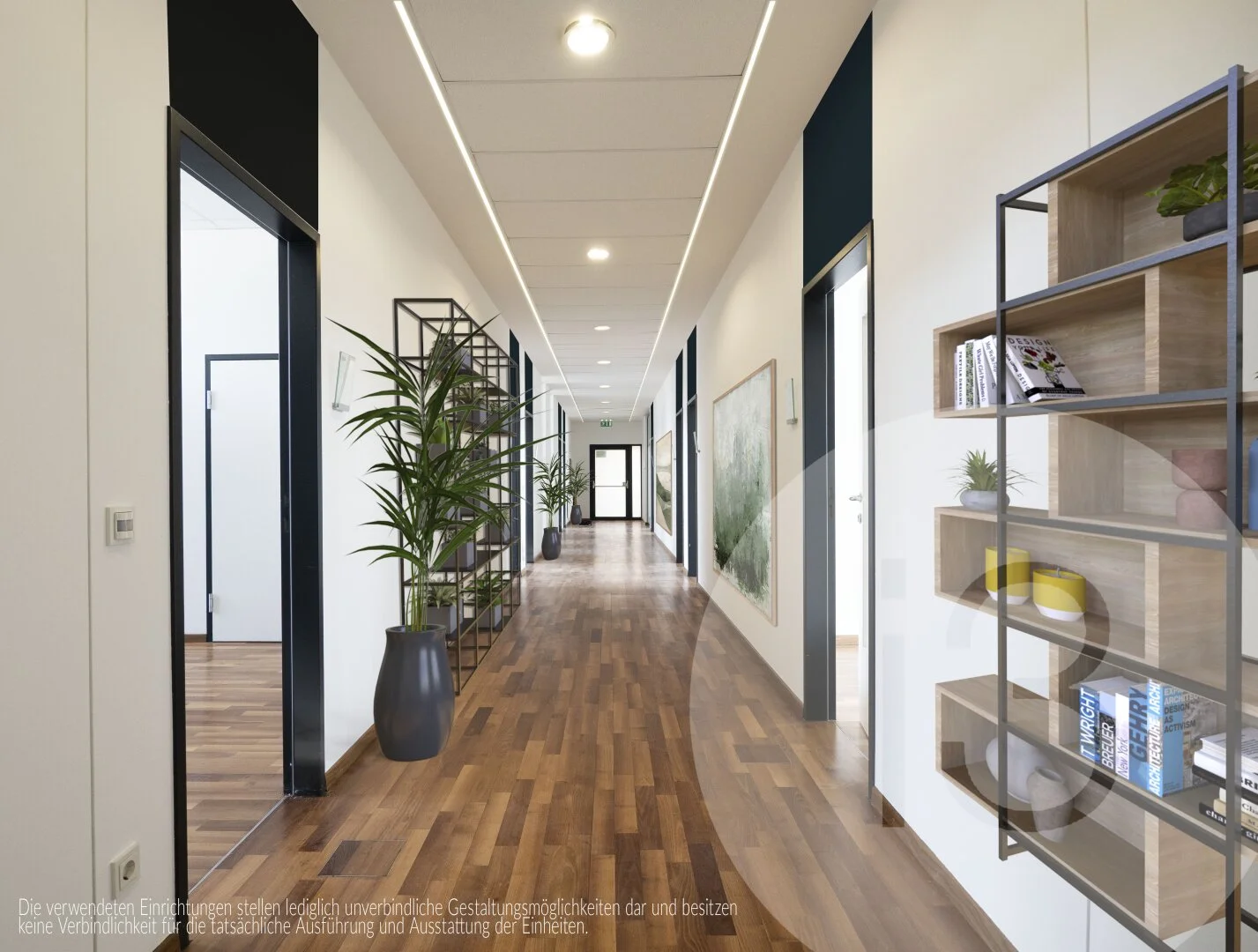 Die Mieteinheit befindet sich im unmöblierten Zustand. Die verwendeten Einrichtungen stellen lediglich unverbindliche Gestaltungsmöglichkeiten dar und besitzen keine Verbindlichkeit für die tatsächliche Ausführung und Ausstattung der Einheiten.