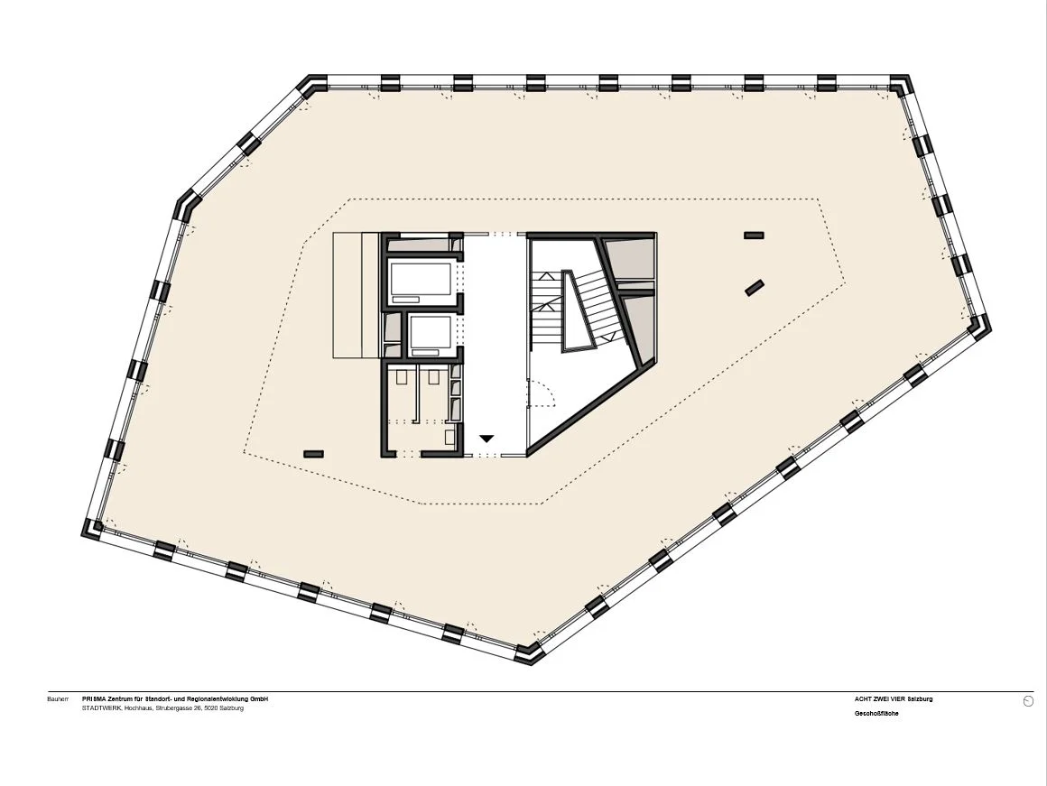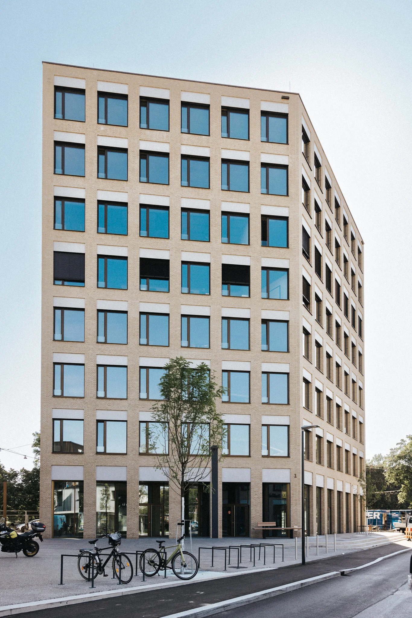Das Gebäude Ensemble mit acht, zwei und vier Geschossen, nach Plänen von Dietrich | Untertrifaller Architekten, setzt an einer der zentralen Zufahrtsachsen Salzburgs einen markanten städtebaulichen Akzent.